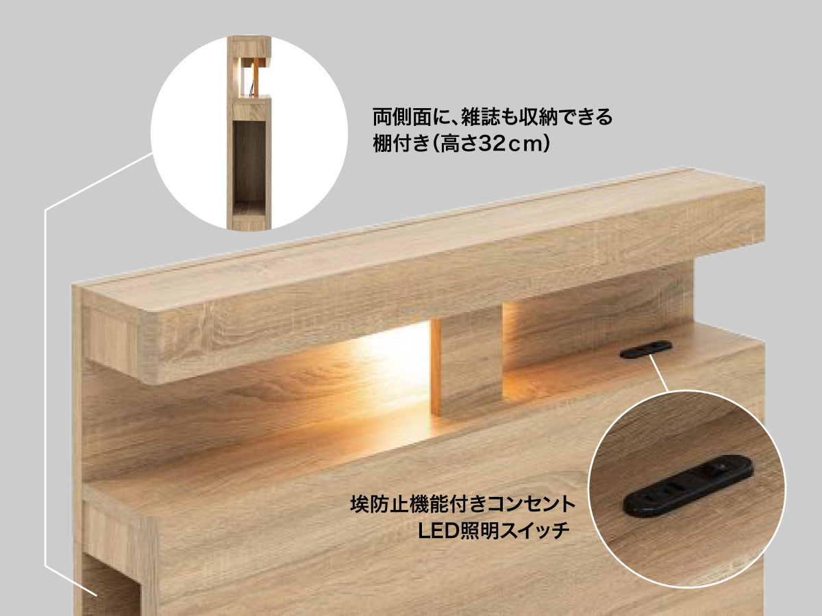 ヘッドボードはキャビネット&LED照明付きで、奥側のキャビネットは眼鏡や時計の小物を置くのに便利。 また1ロコンセントも付いているので、携帯を充電しながら置く事も可能です。 更に、ヘッドボード横にも収納棚がついているので、物が多くてもすっきり収納が可能です。