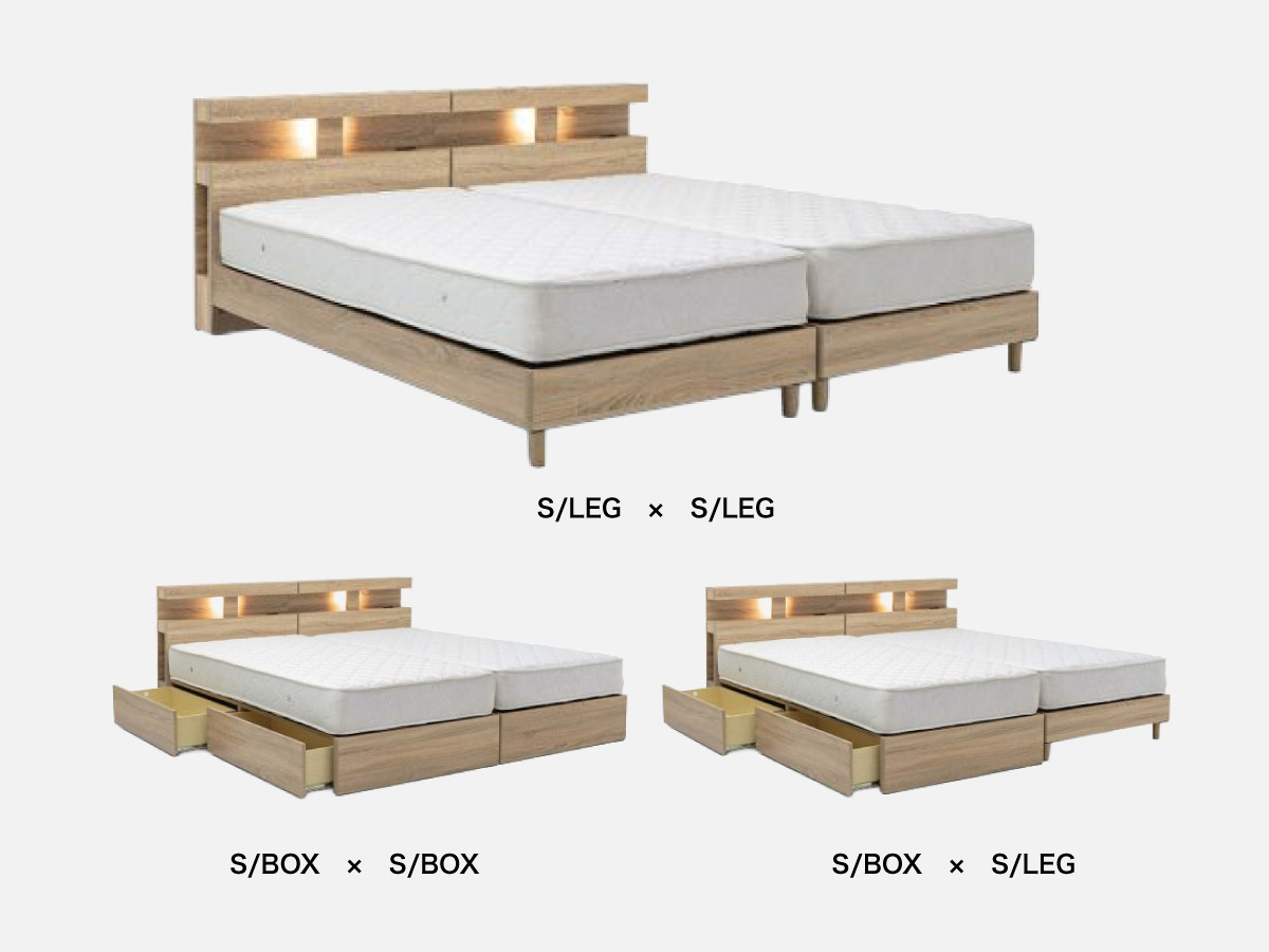 3サイズ・2色の展開に加え、足元すっきりの「脚タイプ」と収納力のある「引き出しタイプ」から選べる全12パターンの豊富なラインナップ。特に脚タイプは付属脚でハイ・ローの切り替えができ、脚を外せば低床ベッドにもなる3段階の高さ調節が可能。立ち座りの楽さやお子様の安全など、生活スタイルに合わせて自由に設置できます。